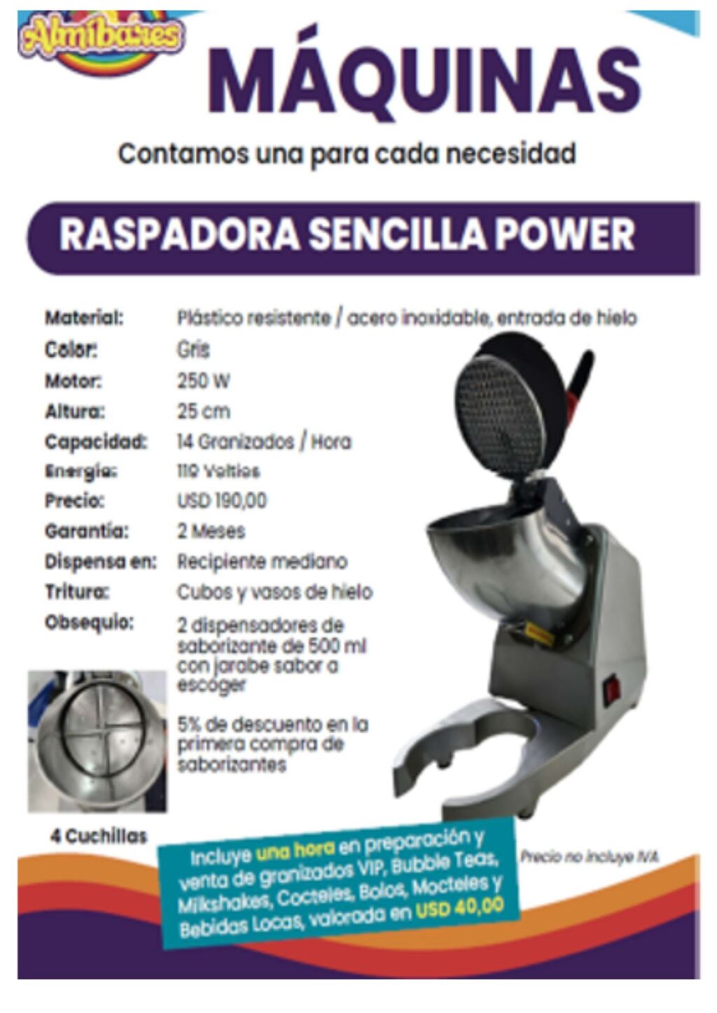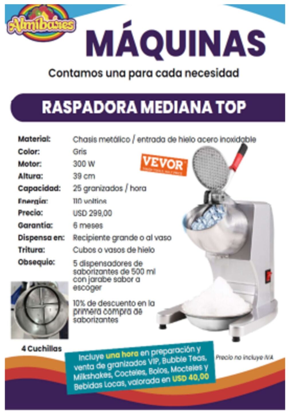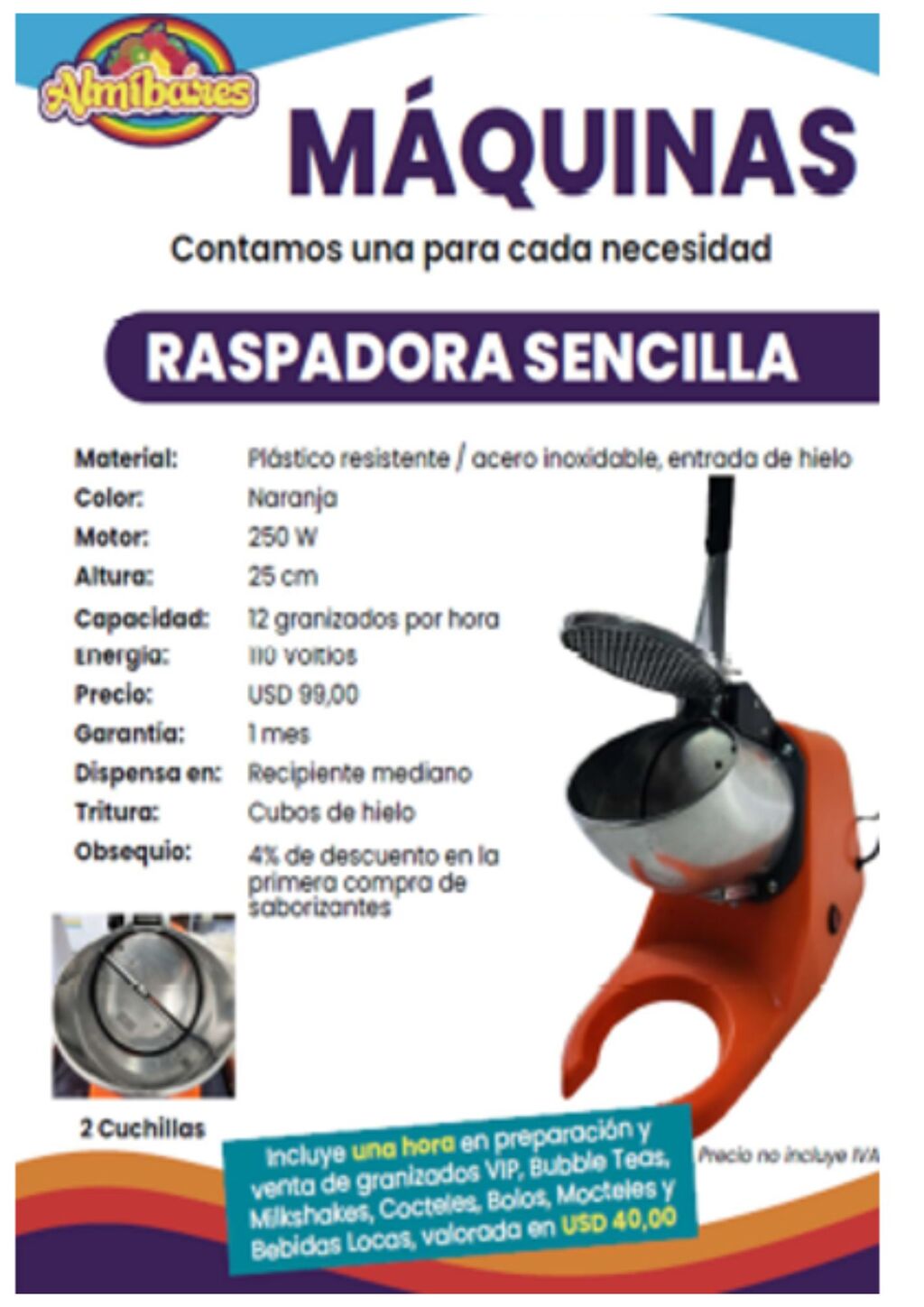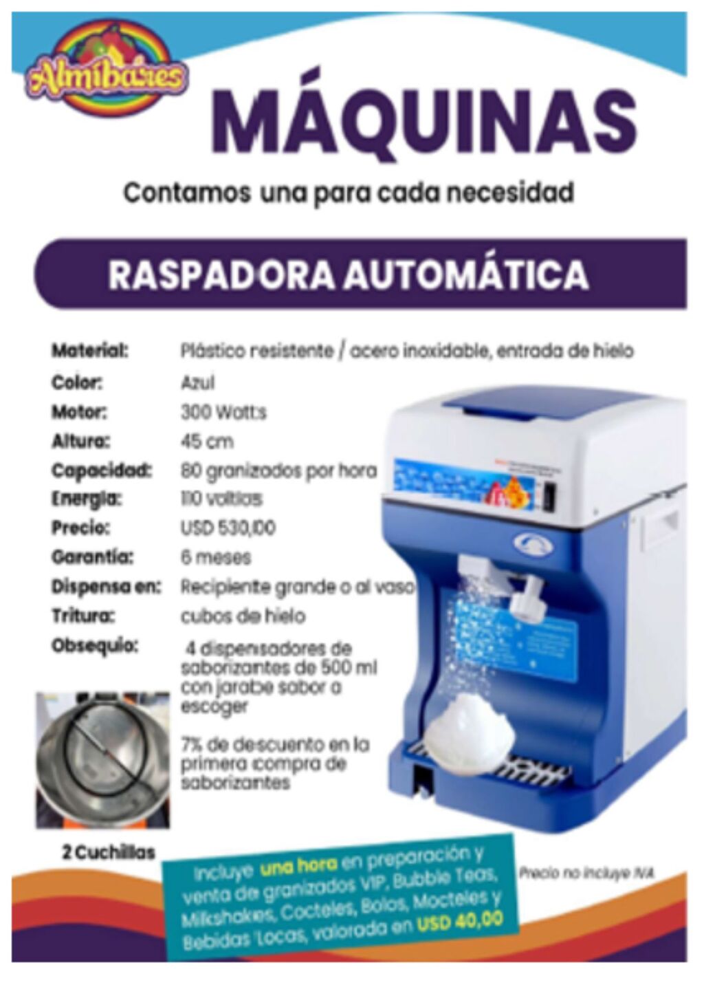 En Almibares sabemos que cada gran idea comienza con una pequeña inversión. Nuestras máquinas para granizados, desde solo 99 USD, son la oportunidad perfecta para implementar nuevos productos en tu local, crear islas en centros comerciales o iniciar un emprendimiento propio con alta rentabilidad.